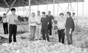 張穎波、鄧錦宏在曹里綠橄欖蔬菜園區(qū)了解黃金瓜生產(chǎn)銷售情況。記者 王泉林 攝